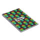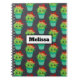 A personalized spiral notebook with a repeating pattern. A cute illustration of a plump round cactus, with big kawaii eyes, smiling and wearing a red sombrero. Standing inside a flower pot. The background is a black chalkboard image.