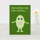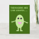 A cartoon of a smiling green grape with shiny black eyes and a pink mouth on a dark green background. On the outside is the beginning of a joke about teenagers, which is finished on the inside.