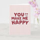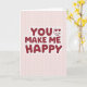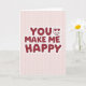 This card features a pale pink grid background like a soft notebook page, setting a gentle, cozy scene for a romantic note. Centered in the middle, the large message “YOU MAKE ME HAPPY” draws the eye right away. The letters are rounded and bubbly, filled with deep crimson and edged with a lighter red outline that gives them a softly raised look. In “YOU,” the “O” is replaced by a heart-eyes face that adds a sweet, adoring glance 🥰❤️. The grid lines stay faint and tidy behind the text, keeping everything organized without stealing attention. With the heart-eyes face nestled among the letters, it feels like someone is looking at their favorite person while saying the words out loud. The text sits squarely in the center, and the red lettering stands out clearly against the pale pink grid.