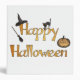 Happy Halloween! Fun, decorative writing with a witches hat, a witches broom, a black cat, and a jack-o-lantern pumpkin.