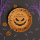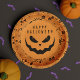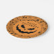 The plate features a spooky jack o lantern pumpkin face at the center, with customizable text above it that reads “happy Halloween”. Around the edges, a decorative pattern brings the whole theme to life with classic Halloween elements like spider webs, skulls, a half moon, witch hats, stars, and flying bats—plus hints of ghostly charm for that extra spooky touch.