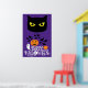 Happy Halloween black cat bats pumpkins on purple Poster. Cool, fun and unique Halloween Wall Art Décor gift idea for anyone. You can customize dark purple color and text. Orange Halloween pumpkins jack O'lanterns, white ghosts and black cat and bats on purple.