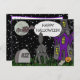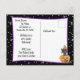 A cute hand drawn whimsical black cat with Halloween colors purple, orange and lime green hat and patches, standing by a haunted mansion and a bull moon with a bat flying in front of it. These are a cute affordable way to say Happy Halloween to your friends and family or co workers. Also good for business to send out to their customers.