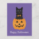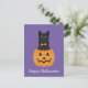 Cute illustration of a black cat wearing a bow tie coming out of a jack o' lantern.