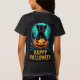 Cute black panther kitten perched on a bright orange pumpkin with teal leaves above bold leopard-print “Happy Halloween” lettering. Playful, festive and whimsical artwork ideal for seasonal cards and decor.