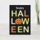 Large bold graphic letters spell out HALLOWEEN, with happy in a modern cursive font in white. Orange and bright green stand out with patterns of dots and diagonal stripes. A carved pumpkin replaces the letter O. A fun and brightly colored card perfect to wish a happy halloween!
