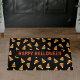 Trick or treat! Festive door mat features an allover candy corn print in swirly watercolors, on a spooky black background with "Happy Halloween" in festive orange text. Coordinating items available in our shop!