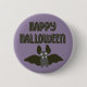 Show off your Halloween spirit with this cute pin or button. It features a cartoon style illustration of a flying bat with a toothy grin and the message Happy Halloween against a smoky purple background. Makes a fun Halloween party favor or small gift.