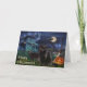 Spooky scene with two black cats in front of a haunted house with ghosts, bats, a pumpkin and a witch flying on a broom across a full moon. Text "Happy Halloween".