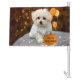 Happy Halloween celebration with maltese puppy and festive orange and yellow balloons. It's party time!