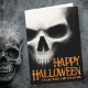 Happy Halloween greeting card featuring a white, creepy skull on a black background with your custom name and orange text “Happy Halloween” in an ornate, gritty font.