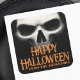 Happy Halloween stickers featuring a white, creepy skull on a black background with your custom name and orange text “Happy Halloween” in an ornate, gritty font.
