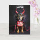 A cute dachshund pup holding a trick-or-treat bag, all ready for some Halloween goodies! Dressed up in a devil costume complete with horns and everything.