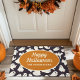Happy Halloween Cute Ghost Personalized doormat features a black and white ghost pattern with "Happy Halloween" centered in a white script font. Personalize it with your family.