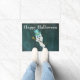This outdoor welcome door mat has a white dressed up ghost floating in a star filled night sky wearing a fancy blue top hat and holding a black and gold cane with a golden skull. Customize the Happy Halloween text with the template.