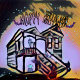 The main colors are purple, green, and yellow. The main elements are the cats and trees.