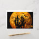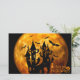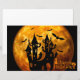 This design features a happy Halloween greeting with an image of full moon lit up in a spooky shade of bright orange. You can also see a haunted house and bats flying in the air. Next to the text are two small images: one of a cat and another of a pumpkin, both of which are associated with Halloween.