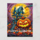 This unique postcard features a spooky pumpkin after dark, in front of a haunted house.