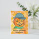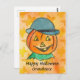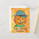 A custom "Happy Halloween" postcard featuring a happy Jack-o-lantern pumpkin in a bowler hat with a background of floating golden yellow stars on an orange watercolor wash background. You can change the text to fit your needs.