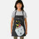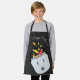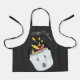 A Halloween apron with a ghost pail that’s filled with candy. This fun apron includes the words “Happy Halloween” that can be customized. The apron’s color scheme is gray and white.