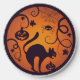 Happy Halloween circle badge with jack-o'-lantern black cat and bats typography