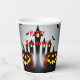 Happy Halloween - Let's be Scary Paper Cups with Creepy Jack o Lantern and flying bats for your Halloween party table décor. Design features a nocturnal scene with carved pumpkins in the foreground with witchy buildings in background and bats flying in the night sky. Part of the Creepy Jack 'o Lantern Collection. The wording can be changed as desired by using “Personalize this template” or the “Edit design” tabs. By using the “Edit Design” tab you can change the font style, size and color. Happy Halloween!