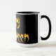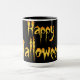 Cool looking orange and yellow Happy Halloween text on a black background. Fun and decorative coffee cup to celebrate the holiday.