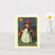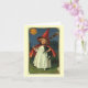 Quality note card featuring a cute little witch with a broom, a black cat, and a jack o'lantern moon smiling over her shoulder. Features vintage, copyright free art in the public domain, circa turn of the century.