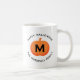 This scary cute personalized fall coffee mug features an orange pumpkin with white custom monogram initial and modern black "Happy Halloween" wording with custom family name text that can be personalized.