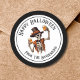 Give some adorable party favors to guests at an annual Halloween costume party, or any event with this fun and simple sticker. A simple overall black and white look that has a simple vintage grunge typography. A drinking skeleton with top hat and orange vest gives it some character. Outlined with black circles. Personalized Fun Spooky Pirate Drinking Skeleton Happy Halloween Party Classic Round Sticker