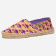 This awesome pair of espadrilles features a cute owl with its eyes shut as if it is sleeping and cute claws. Its body is purple and its wings, ears and claws and beak are orange. The owl is holding a balloon with “happy Halloween” written on it and is ready to party.