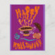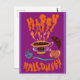 Original illustration of a cat lover witche’s cup of coffee with poisonous potion, witch a bat, pumpkin, magic wand and little steam ghosts with hand lettering saying Happy Halloween. In orange and purple bold maximalist style and colors.