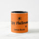 Happy Halloween! Mug with spiders and webs on it. Orange background and black border around it, and says "Happy Halloween" on it. Also has: Lynne Smith" that you can change to whatever you want on it. Great to use for a Halloween party. Just fill the cup with treats to give out as favors.