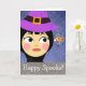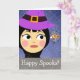 Cute Halloween greeting card with Happy Spooks! written on the cover. Wish them a little spook and a big treat for Halloween with this cute witch character with purple witch hat, big eyes, cobwebs, spider, and big piece of candy corn. Change the text on the cover as you wish. Art, image, and verse copyright © Shoaff Ballanger Studios, 2022.