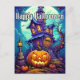 This awesome postcard features a Halloween themed haunted house in the Fall season.