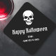 Halloween coasters featuring a skull and the text: "Happy Halloween" in a gothic style font with your name or other custom text below on a black or custom color background.