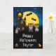 This fun and spooky Halloween card can be personalized with a name or title, such as daughter, granddaughter, niece, friend etc. It features cute werewolves beside a crooked haunted house. In the background is a full moon with bats and a blue night sky with stars. The text combines decorative and serif fonts for a stylish and modern look. This is perfect for Halloween.