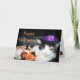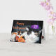 Cute calico cat Missy is posing with a pumpkin cat toy and witch hat. Customize this cute Halloween animal card design with a name or message to make it a great personalized holiday gift that is great for cat lovers.