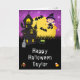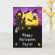This fun and spooky Halloween card can be personalized with a name or title, such as daughter, granddaughter, niece, friend etc. It features a cute witch beside a crooked haunted house. In the background is a full moon with bats and a purple night sky with stars. The text combines decorative and serif fonts for a stylish and modern look. This is perfect for Halloween.