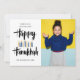 Festive Hanukkah Holiday photo greeting card featuring your best portrait photo and "happy hanukkah" in hand lettered style brush typography and candles in shades of blues and yellows.