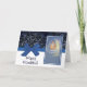Send a beautiful message for the Festival of Lights with this elegant Happy Hanukkah Card. This design features a gently painted single candle against a serene blue and black patterned background. The back features a subtle, coordinating blue and white floral scroll pattern.