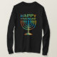 Celebrate Hanukkah with this colorful holiday long sleeved shirt for ladies that reads, "Happy Hanukkah" over a menorah.