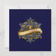 Elegant Jewish Star of David (Magen David) traditional blue and white hexagram symbol against a gold and black baroque fluerish background with a gold ribbon and holiday greeting wishes for a Happy Hanukkah. Art of artist Margaret Loftin Whiting.