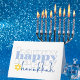 This Hanukkah greeting card features a playful and modern design that is sure to bring joy to its recipients. The front of the card prominently displays the phrase “happy happy happy” in a chunky lowercase font. The center “happy” is light blue, while the upper and lower “happy” text is white, outlined in dark gray. The light blue “happy” overlays the white ones, creating a unique layered effect that reads as “happy happy happy Hanukkah.” Below this cheerful trio of “happy” words is a yellow Star of David on the left, accompanied by the word “Hanukkah” in dark blue modern script text. This interesting use of fonts and colors adds a contemporary twist to the traditional holiday greeting.
