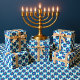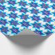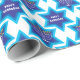 This festive Jewish wrapping paper features a repeating pattern of bold blue Stars of David framing the cheerful message “Happy Hanukkah.” Within the design, a classic nine-branched Hanukkah menorah (hanukkiah) glows with colorful candles — red, yellow, and orange flames shining brightly. The cool blue tones create a vibrant contrast with the warm candlelight, symbolizing joy, light, and celebration. Perfect for Hanukkah gifts, the design blends tradition and festivity with a clean, modern aesthetic that radiates warmth and holiday spirit.