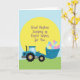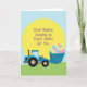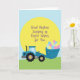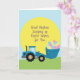 This card shows a stylized blue farm vehicle with a front loader sitting on a bright green patch beneath a pale blue sky. In the middle distance, a large yellow circle reads as a sun, creating a sunny backdrop that draws your eye right away 🌷. Across that yellow circle, a short greeting appears in purple lettering, centered and easy to spot. The loader scoop is tipped upward and filled to the brim with egg-shaped decorations, like a shared stash meant for someone you care about 🐰. Each egg is tinted in soft pastels—pink, light blue, mint, and buttery yellow—so the pile feels gentle and sweet rather than loud. Thin stripes and curving swirl patterns on the eggs add a tender, gift-like look, as if they were gathered with a friend in mind. The blue vehicle is simple and sturdy, with dark wheels and a squared cab, while the eggs form a rounded cluster that contrasts against the flat green ground. The purple text sits over the yellow circle, and the eggs show alternating stripes and swirls in pastel shades inside the raised scoop.