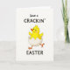 The front design shows a bright yellow baby bird centered on a white background, just hatched and standing in a cracked white eggshell like it’s stepping into a friendly spring hello 🌷. Its wings stretch outward as if reaching for a hug, and its wide eyes and rosy cheeks give it a sweet, affectionate look. A small orange beak and slim orange legs add warm contrast, making the little character feel lively and eager to meet someone special. The broken shell pieces angle outward around its feet, adding motion and a sense of shared excitement, like a cheerful surprise meant for a close friend. Above and around the illustration, the phrase “have a CRACKIN’ EASTER” appears in black, with “CRACKIN’” in all caps to stand out. The lettering is slightly uneven and casual, framing the bird without crowding it, while the open white space keeps the focus on the tender, welcoming pose 🐰. The palette stays simple with sunny yellow, soft white, and orange accents, and the jagged shell edges are drawn in crisp lines against the plain background.
