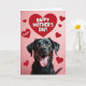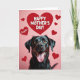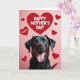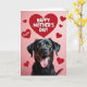 This card shows a dark-furred dog centered along the lower portion, set against a soft pink background that feels gently affectionate ❤️. The dog’s amber eyes look straight out with a friendly, devoted gaze, like it’s greeting someone it adores. Its mouth is open in a big grin, with a pink tongue showing, adding a light, companionable energy. Above the dog, a large red heart fills much of the upper area, creating a romantic, caring focal point. Inside that heart, white text is placed centrally to mark a Mother’s Day message, standing out clearly against the red. Smaller red hearts are scattered around the scene, and one on the left includes a short white line indicating who the message is from, adding a family touch 👩. The contrast between the deep black fur, the red hearts, and the blush pink background keeps the layout easy to read, with the biggest heart sitting prominently at the top. The red heart shapes vary in size, with the largest one near the top center and several smaller ones drifting around the edges.