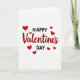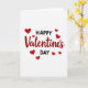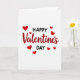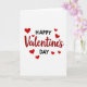 This greeting card features a white background with the words “Happy Valentine’s Day” centered on the front. “Happy” and “Day” are written in simple black sans-serif letters, one above and one below the middle word. “Valentine’s” sits in the center in deep red cursive lettering, making it the main focus. Small solid red hearts are scattered around the text, like they’re floating in the open space. The hearts vary a bit in size and help frame the message without crowding it. The black and red colors stand out clearly against the white, giving it a warm and classic look ❤️💘. It’s an easy, sweet way to share Valentine’s Day sentiments with someone you care about.
