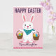 This card shows a stylized white bunny 🐰 centered on a smooth pastel pink background, with simple black oval eyes, a small pink nose, and a curved smile that feels friendly and inviting. Around its neck sits a blue bandana dotted with small yellow circles, adding a sweet touch of contrast. The bunny holds two woven baskets, one on each side, as if offering them with a gentle, sharing gesture that suggests closeness and care. Each basket is filled with decorated egg shapes in yellow, blue, green, and pink, covered in stripes, zigzags, and polka dots for a festive look 🌷. Near the top, a seasonal greeting appears in dark purple letters, centered and easy to read. Beneath that, a second line in a thinner, flowing style sits closer to the bunny’s head, also in purple, as if addressed to someone special. Along the bottom edge, a soft border of wavy pink lines runs horizontally like a quiet decorative trim.